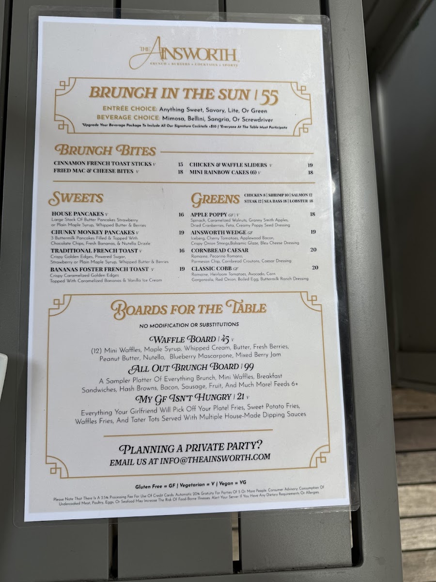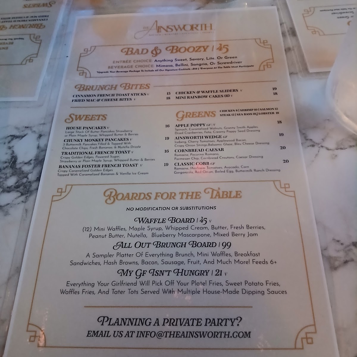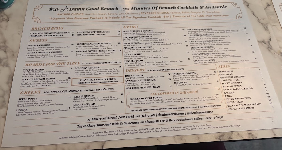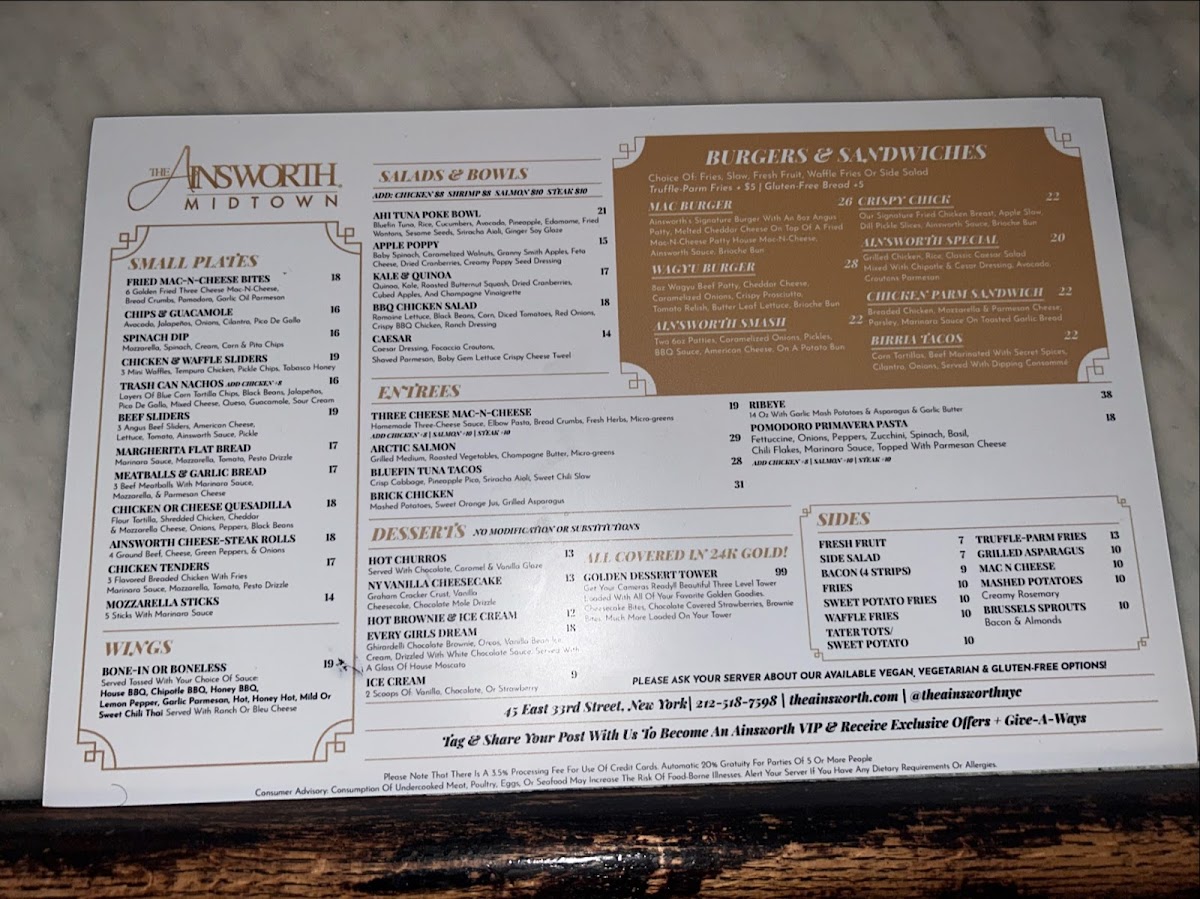 “ As someone who travels for food, I was pleasantly surprised by The Ainsworth in Midtown NYC, especially after seeing a few mixed reviews online. My friends and I visited for brunch, and it was a fantastic experience from start to finish. The menu offers a wide range of brunch options — from creative pancake breakfast tacos to a delicious veggie omelet, McGriddle sandwich (with chicken, turkey bacon, and eggs), and perfectly cooked steak and eggs. Every dish was made with care and flavor. The team was accommodating with any adjustments, and service was truly 10/10. If you’re celebrating a birthday or special occasion, this is the place to feel like royalty. The staff went above and beyond . For a group that doesn’t drink alcohol they made mocktail shots for us to enjoy and keep celebrating — even helping me surprise my friend with a birthday sash and tiara — and the complimentary dessert was yum yum! The DJ kept the energy high with great music, so if you prefer a quieter setting, request a seat up front or upstairs. We loved the lively vibe and had an absolute blast. Between the great service, delicious food, and photo-worthy rooftop ambiance, The Ainsworth Midtown is a must-visit brunch spot. Bonus: there’s a parking garage right next door. ⭐ Food: 10/10 ⭐ Service: 10/10 ⭐ Ambiance: 9/10 ”