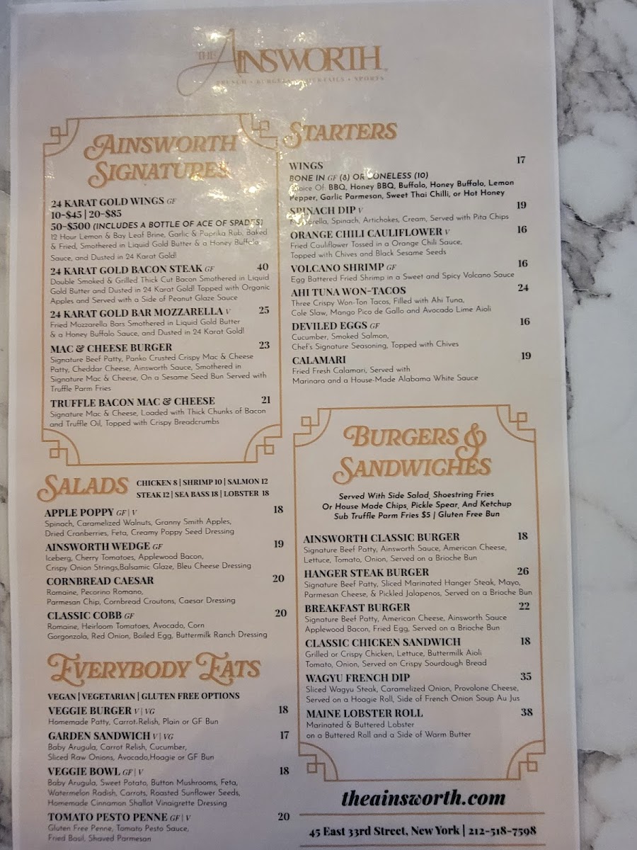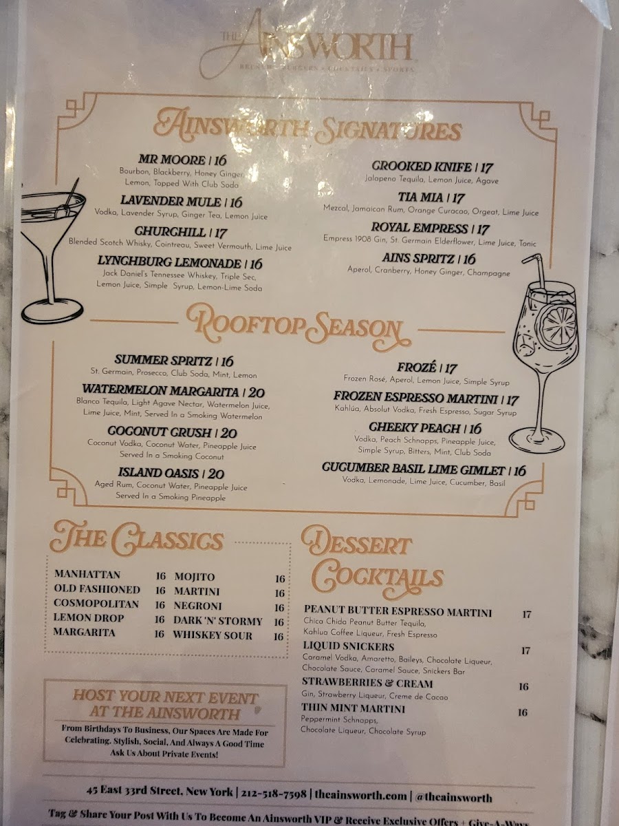 “ The Ainsworth Midtown is easily one of the most beautiful and Instagrammable restaurants in New York City. The space is stunning, the main floor has a lively bar and a huge back room for brunches or private events with DJ setup, and the rooftop lounge is perfect for summer nights with views of the skyline. The food was outstanding. I started with the Honey Buffalo Wings, Truffle Bacon Mac & Cheese, and Ahi Tuna Won Tacos, all flavorful and perfectly prepared. For entrées, I had the Bone Marrow Cacio e Pepe, which was rich, creamy, and genius, and the Lamb Chops with truffle mashed potatoes, roasted carrots, and a red wine apple glaze that balanced the dish beautifully. The cocktails were just as impressive: the smooth Espresso Martini, fruity Sangria, and the signature Mr. Moore made the experience complete. Overall, it’s upscale but welcoming, perfect for brunch, dinner, or rooftop drinks. Highly recommend if you’re looking for a stylish Manhattan spot with incredible food and drinks. ”